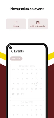 NEVER MISS AN EVENT The event section shows a list of events throughout the district. Users can add an event to your calendar to share the event with friends and family with one tap.