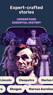 • Short, Curated Lessons: Discover captivating stories from history, centered around key figures like Cleopatra, Abraham Lincoln, and more. Each lesson is designed to be concise yet informative, giving you a deep understanding of important historical events and personalities.