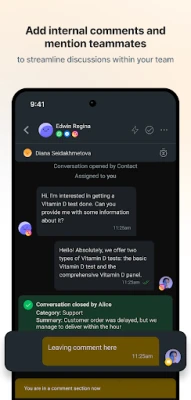 - Team collaboration: Assign or re-assign conversations to other Agents and add internal comments to provide context.