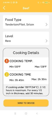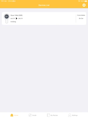 1. Control the sous vide cooker to start heating, cooking countdown, keep warm or stop cooking; 2. Set the cooking temperature and cooking time of the device; 3. Schedule the device to start and stop cooking in advance; 4. Set the temperature to be displayed in Fahrenheit or Celsius; 5. Provide users with cooking guide and customize recipe function.